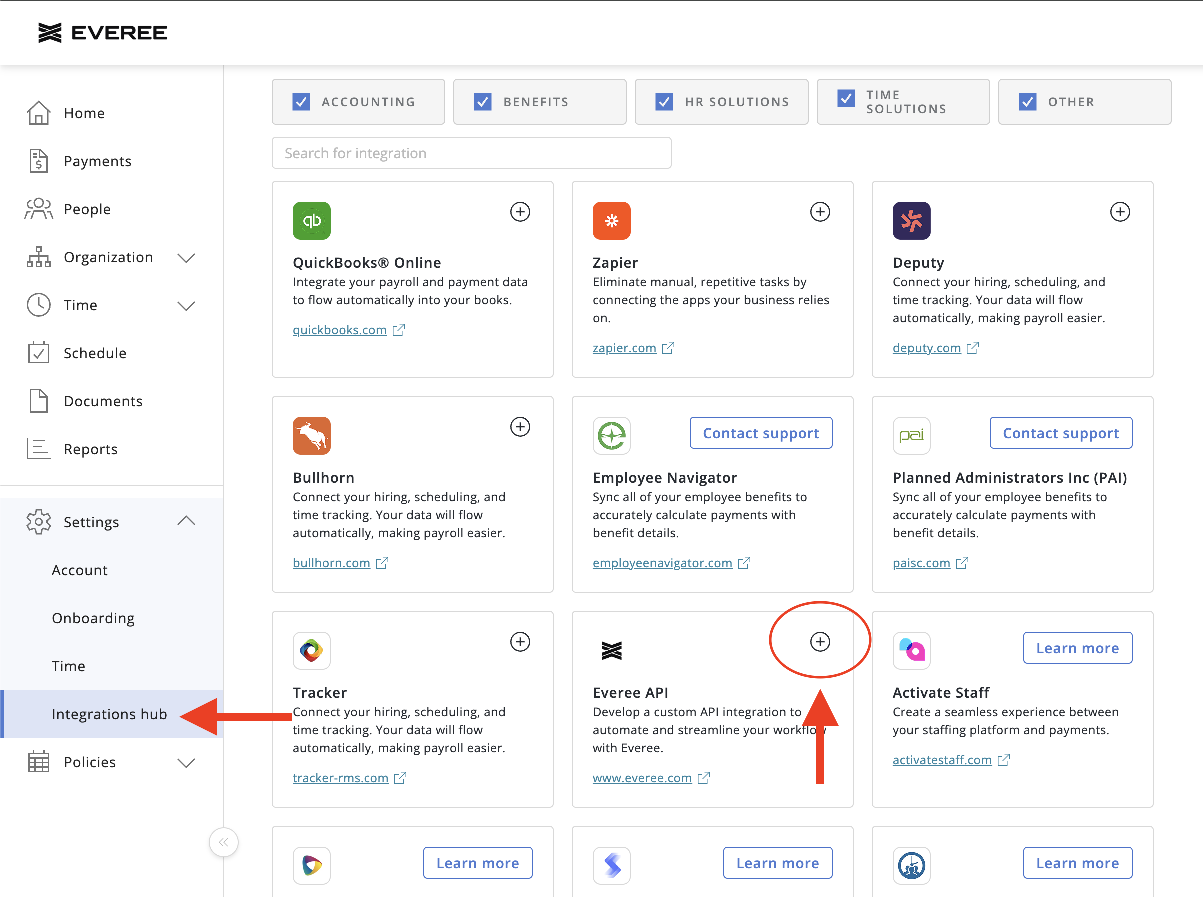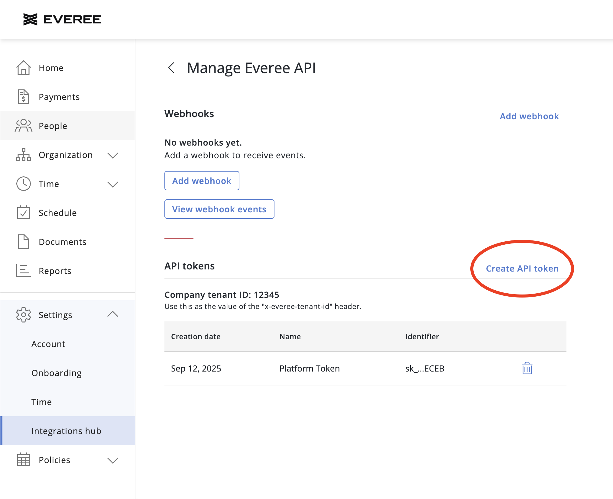 You can generate an API token in the Integrations Hub section of the Everee web app. Find the section called "Everee API" and click the ➕ icon: